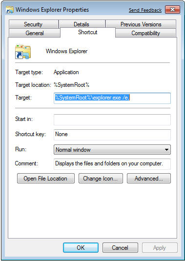 then click Properties - Add the following to the end of the command in Target: /e,